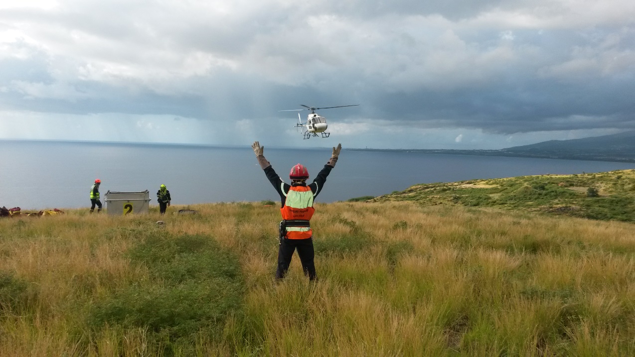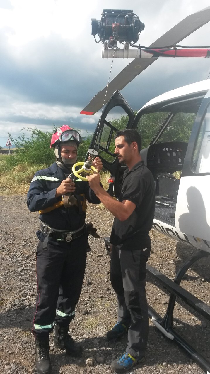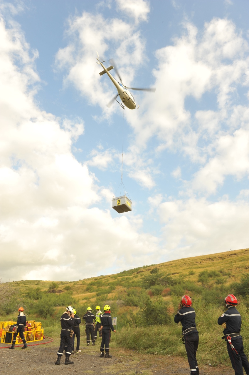 Après un briefing sécurité avec l'ensemble des participants, l'hélicoptère bombardier d'eau (HBE) mis à disposition pour la manœuvre effectue une 1ère rotation de reconnaissance du terrain avec à son bord, le chef du Groupe du DIH et son adjoint. Lors de cette reconnaissance, il identifie les différentes zones (zone d'emport, de poser, d'attaque et de repli). Les norias sont réalisées suivant un ordre précis sur chaque zone : Personnes, Matériels, Eau.