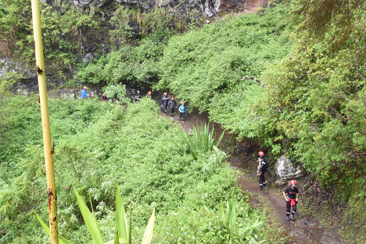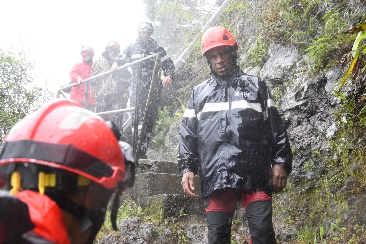 Direction la Plaine des Cafres, en convoi, pour la suite des opérations où le test de sélection s'est alors transformé en une véritable aventure à cause de la dégradation des conditions météo. Une pluie battante et un vent incessant sont, en effet, venus accompagner le groupe pour le reste de la journée. En particulier, sur le sentier qui va du site de l'Horloge à Grand Bassin, dans le cadre d'une marche en montagne avec charge. Marche au cours de laquelle l'esprit d'équipe prévalait sur la performance individuelle.